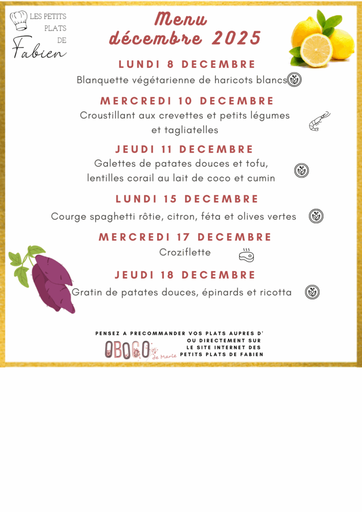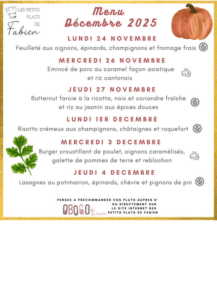 Voici les plats proposés pour les 2 prochaines semaines de Septembre de Les petits plats de Fabien 🍲.