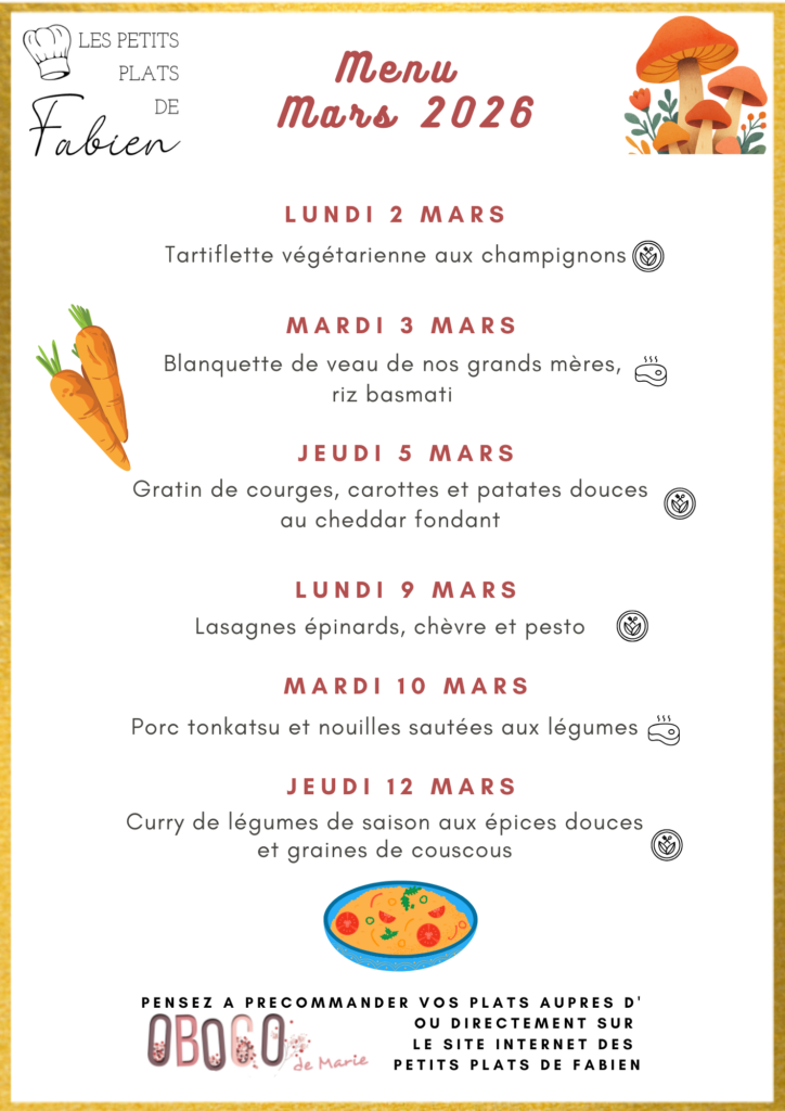 Voici les plats proposés pour les 2 prochaines semaines de Septembre de Les petits plats de Fabien 🍲.