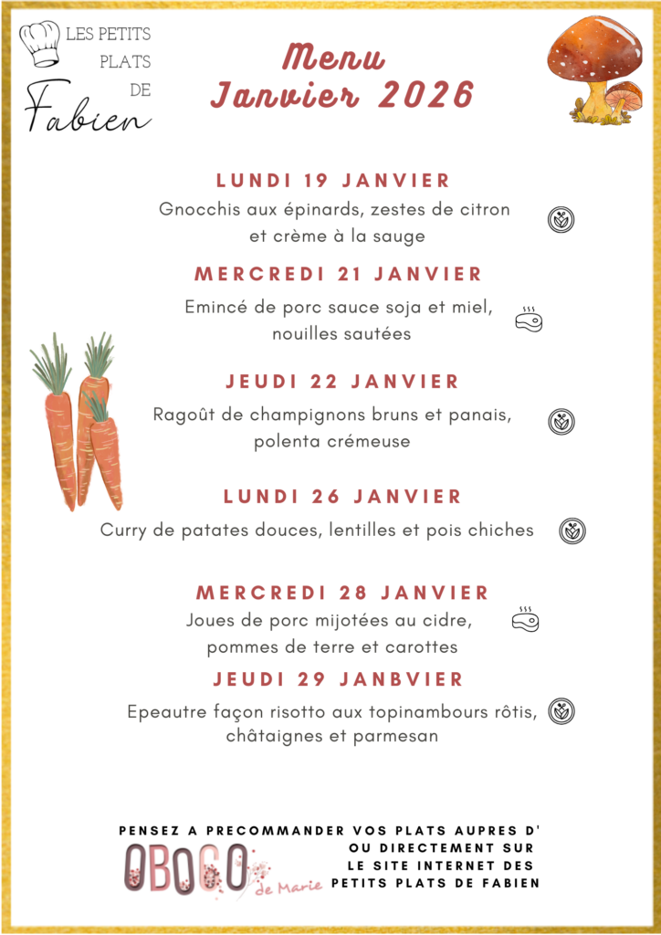 Voici les plats proposés pour les 2 prochaines semaines de Septembre de Les petits plats de Fabien 🍲.